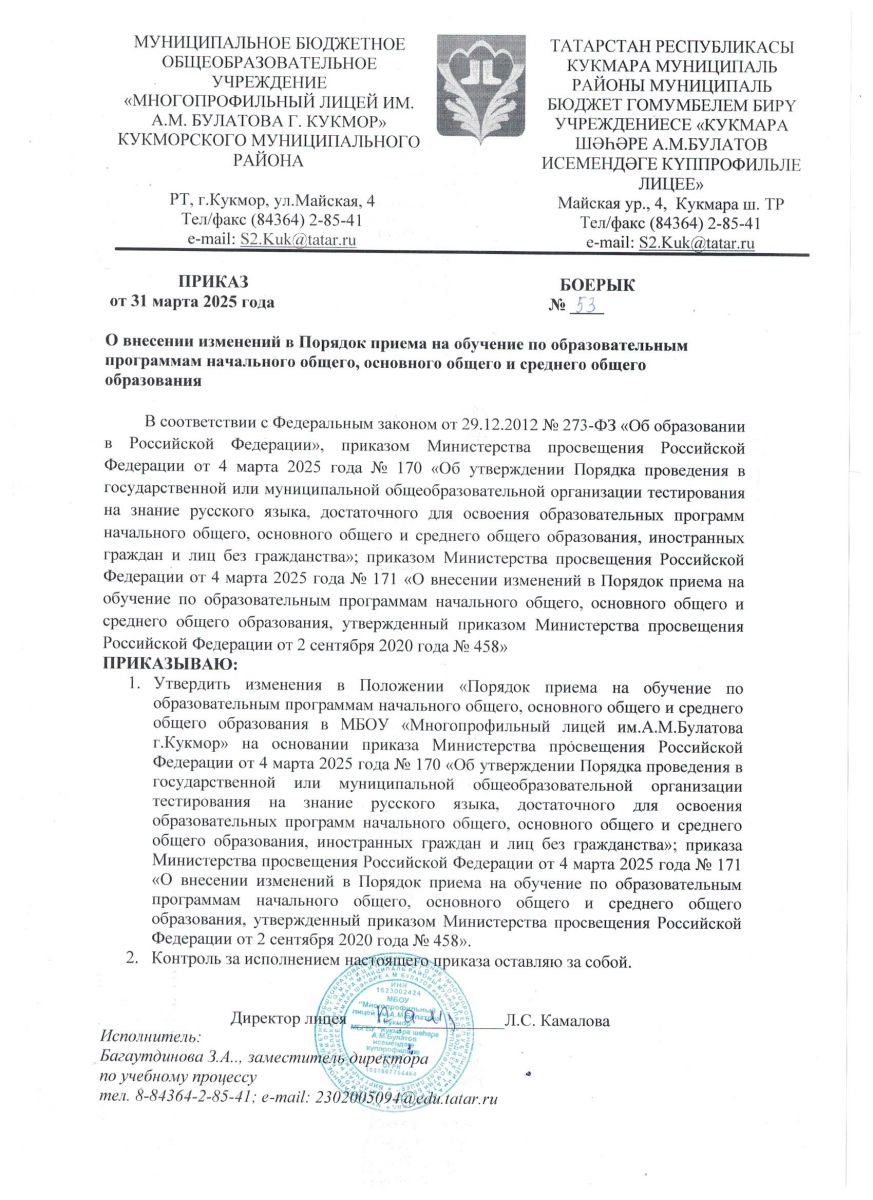 - Приказ по лицею №53 от 31 марта 2025 года "О внесении изменений в Порядок приёма на обучение по образовательным программам начального общего, основного общего и среднего общего образования в МБОУ "Многопрофильный лицей им.А.М.Булатова г.Кукмор"