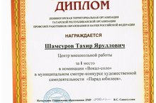 Педагога дополнительного образования - Шамсуарова Тагира Ярулловича поздравляем с 1 местом в смотре-конкурсе художественной самодеятельности "Парад юбилеев" в номинации вокал-соло.
