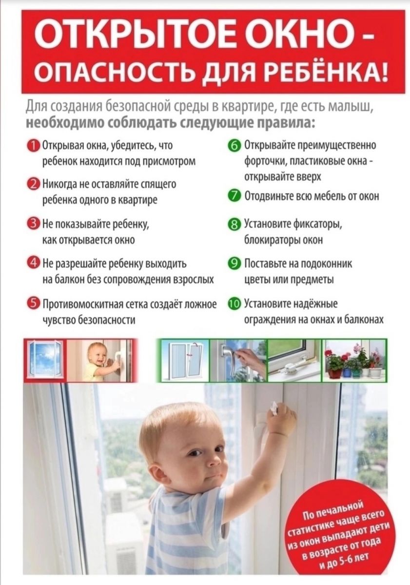 Дорогие родители! В тёплое время года, многие из вас забывают, что открытое окно может быть опасно для вашего ребёнка. Большинство случаев падения детей из окон происходит тогда, когда родители оставляют их без присмотра. Пожалуйста, не оставляйте маленьких детей одних.