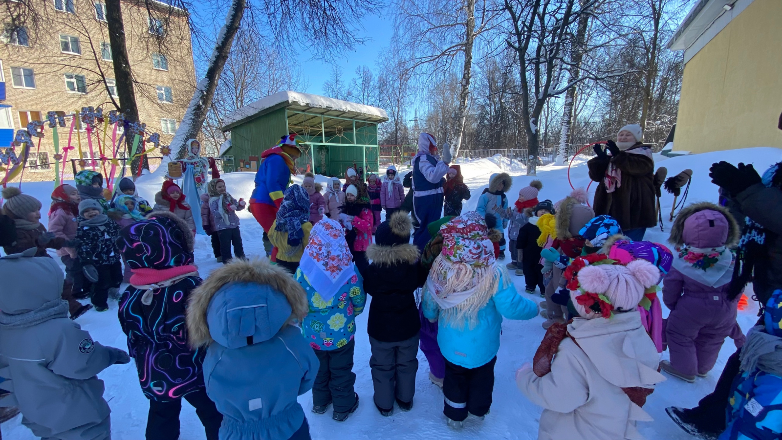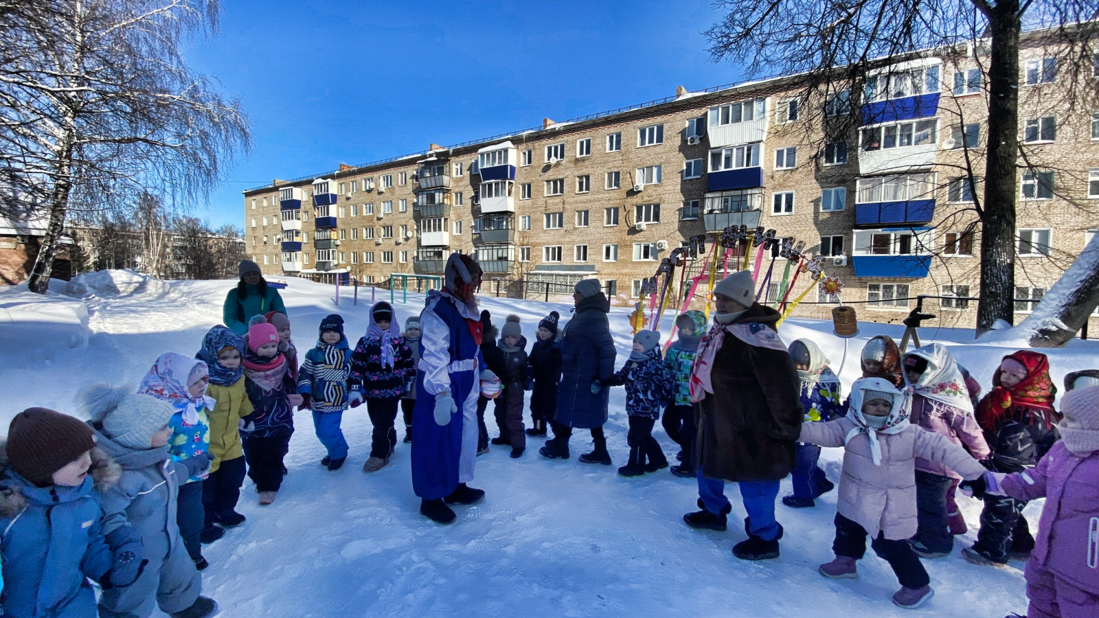 Веселая русская музыка звучала на территории детского сада в последний день Масленицы, а ноги сами пускались в пляс! Развлекали ребятишек веселые скоморохи, в гости приходила проказница Баба Яга, зима и весна, а самым радостным событием была встреча Масленицы. Все водили с ней хоровод «А мы, Масленицу дожидали», катались на каруселях, пели песни, частушки и заклички, играли в веселые народные игры. Конечно же не обошлось на празднике без состязаний и катания на метле с Бабой Ягой! Ну а в завершение праздника всех ждало вкусное угощение – блинчики горячие, да румяные! Зиму проводили, будем ждать весну!