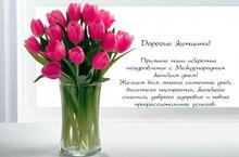 Поздравляем вас, дорогие женщины, с Международным женским днём! Вам желаем счастья и здоровья, радости и любви. Пусть в ваших глазах всегда отражаются улыбки дорогих вам людей. Пусть мир, окружающий вас, будет полон благополучия и радости!
