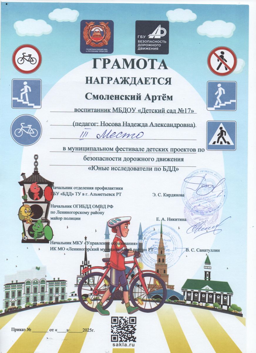 Сегодня в Детском саду №6 прошел муниципальный фестиваль по ПДД среди воспитанников ДОУ. Наш детский сад представлял Смоленский Артём воспитанник подготовительной к школе группы под руководством педагога Носовой Надежды Александровны. Артём достойно защитил свой проект по ПДД "Светофор БЕЗОПАСНОСТИ" и был удостоен призового 3 места. Мы поздравляем Артёма и желаем и дальше идти только к ПОБЕДАМ!