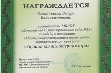 Поздравляем Овчинникову Венеру Валиахматовну, воспитателя детского сада, с победой в номинации «Мастер инновационных технологий» муниципального конкурса «Лучшая компьютерная игра»! Желаем дальнейших творческих успехов и побед!