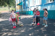 В разновозрастной группе провели эстафеты на самокатах, такие как объезд препятствий, довоз грузов, змейка. Повторили правила катания на самокате и велосипеде. Вспомнили знаки дорожного движения.// Төрле яшьтәгеләр төркемендә үзаякларда эстафеталар уздырганнар, мәсәлән, каршылыклар аша чыгу, йөк, елан алып килү. Самокатта һәм велосипедта йөрү кагыйдәләрен кабатладылар. Юл хәрәкәте билгеләрен искә төшердек.