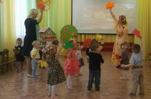 Сегодня в 1 младшей группе прошло музыкальное развлечение «Здравствуй, осень золотая!». В нашем музыкальном зале царила теплая, доброжелательная атмосфера. В гости к самым маленьким ребятам пришла волшебница Осень. Вместе с хозяйкой праздника дети исполнили танец с листочками, поиграли в игру «Прогулка и дождик». Прогуливаясь по осеннему лесу, ребята повстречали зайчика, который с удовольствием играл, танцевал и пел с детьми. Все остались довольными и счастливыми.