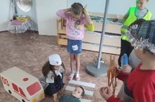 Дети подготовительной группы приняли на себя роли мамы с ребенком, водителей, врача скорой помощи и сотрудника ГИБДД. Они разыграли сценку, в которой невнимательный водитель сделал наезд на ребенка на пешеходном переходе.