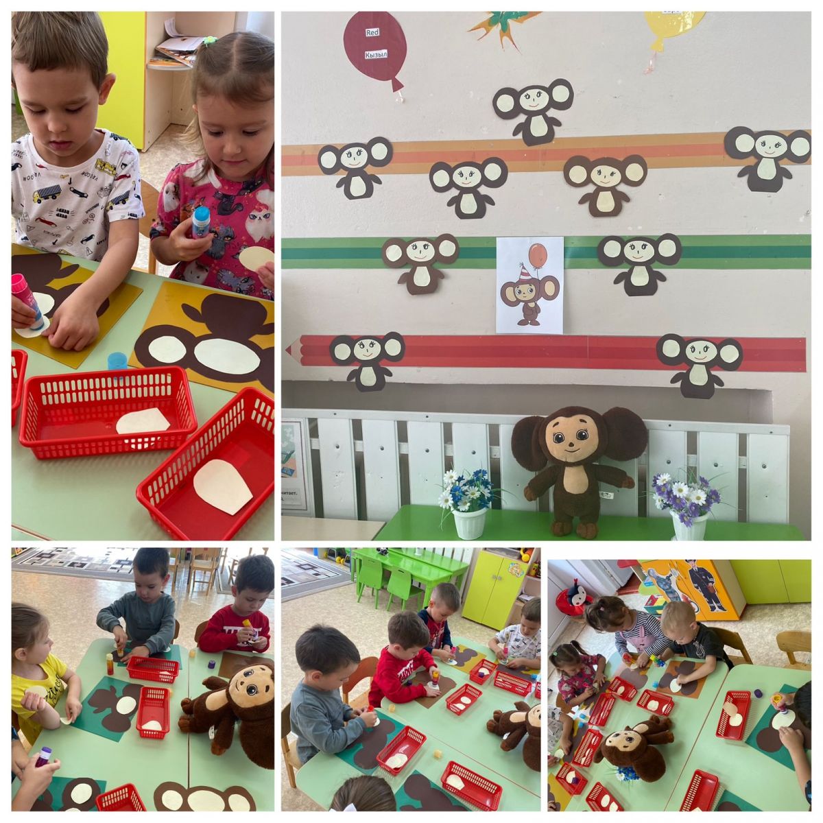 Всем именинникам принято дарить подарки. Дошколята с помощью аппликации смастерили для Чебурашки портреты с его изображением.