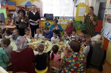 На территории детского сада находится яблоневый сад, который в этом году удивляет своим урожаем. Поэтому дети 2 младшей группы "Сказка" отправились оценить масштабы урожая и рассмотреть сорта яблок, которые растут в нашем саду. Дети с восхищением слушали стихотворение про любимые яблочки, которое прочитала им Юлия Анатольевна: