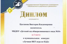 Сегодня стали известны результаты муниципального конкурса «Лучшая ИКТ игра по ПДД» среди педагогов дошкольных образовательных учреждений, в котором приняла участие наш молодой и перспективный педагог Цыганова Виктория Владимировна. Данный конкурс курировался начальником отделения профилактики ГБУ «Безопасность дорожного движения» в Лениногорском районе ТУ в г.Альметьевске – З. М. Рахмановой.