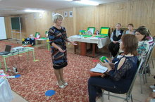 На базе нашего детского сада 2 недели для 25 педагогов дошкольных образовательных организаций г. Лениногорска проходили курсы повышения квалификации с целью повышения профессионального мастерства участников курсов по вопросам, связанных с изменением требований к организации образовательного процесса в условиях реализации федерального государственного образовательного стандарта дошкольного образования (ФГОС ДО). Педагог нашего ДОУ, Мугинова Минзиля Тауфиковна, воспитатель по обучению татарскому языку, была приглашена выступить перед слушателями курсов, чтобы поделиться опытом практической работы с детьми по изучению татарского языка с помощью УМК, по организации билинвального пространства ДОУ, по работе с русскоязычными педагогами. Мастер-класс от лауреата республиканского конкурса вызвал огромный интерес у коллег, благодарность за представленный опыт. -