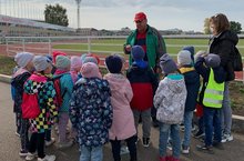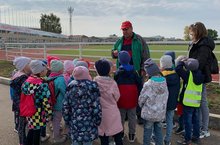С целью расширять представление детей о спортивной жизни, спортивных сооружениях, различных видах спорта, 13 сентября подготовительная к школе группа "Радуга" с удовольствием отправилась на городской стадион. Сентябрьский день выдался на славу! Он был очень теплым и солнечным, как раз для прогулок. На стадионе ребят встретил директор Юртаев Виктор Нестерович. Он рассказал о покрытии футбольного поля, беговых дорожек, баскетбольной площадки, кто может на них заниматься. Дал ребятам футбольный мяч и развешил поиграть в футбол.