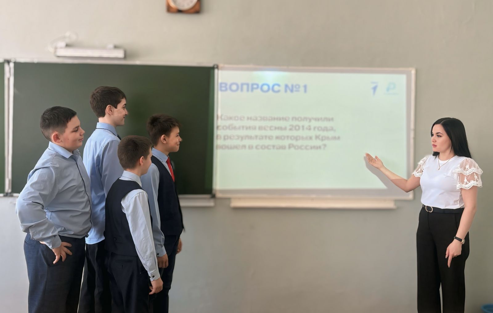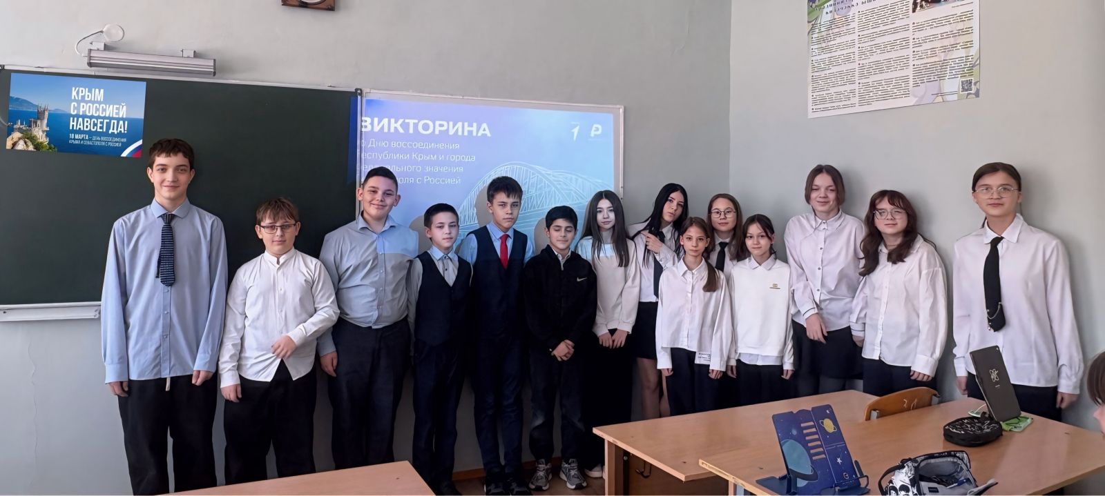 Советник директора по Насырова Л.И. провела викторину в 5 классе, посвященную Всероссийской акции ко Дню воссоединения Крыма с Россией. Викторина помогла ребятам узнать много интересного о Крыме, его истории и культуре. Дети узнали, почему именно 18 марта стало такой значимой датой, какие события предшествовали этому дню. Урок интересным и познавательным.