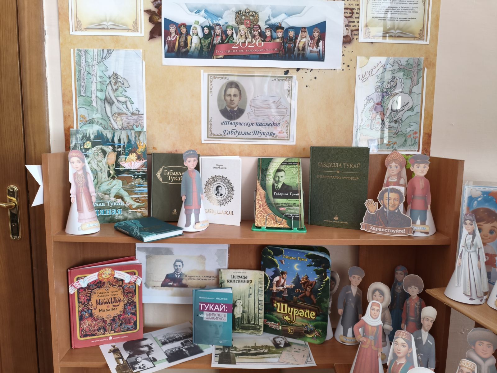 Книжная выставка «Свет поэзии Габдуллы Тукая» посвященная к 140 летию со дня его рождения. 26 апреля татарский народ отмечает 140 летие со дня рождения великого татарского поэта Габдуллы Тукая. В связи с этой памятной датой, 24.03.26г в 3Б классе провели мероприятие "Тукай живёт среди нас". Дети узнали о жизни и творчестве поэта, смотрели мультфильмы, снятые по его детским произведениям, охотно рассказали стихи великого поэта. Стихи Тукая, как мелодичная песня, заставляют нас плакать, смеяться, размышлять и не теряют своей актуальности и по сей день, даже если они были написаны больше века назад.