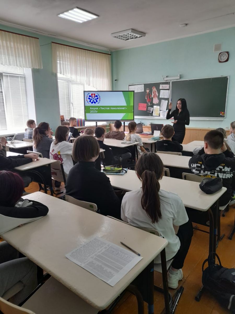 В рамках акции «Чистое поколение 2025» в гимназии для 8б,9в,9б классов, 17 марта была проведена беседа с инспектором по профилактике семейного неблагополучия и правонарушений среди несовершеннолетних Ефимовой Л.М.