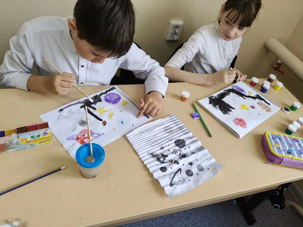 Закрепление урока прошло в творческой атмосфере: ребята создали рисунки, где смогли продемонстрировать всё своё мастерство и выразить восхищение покорителями звёздных просторов.