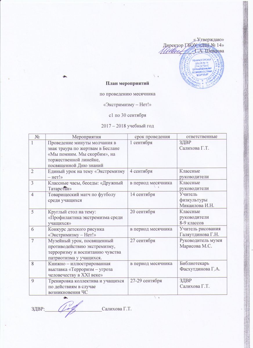 План работы и отчет по проведению месячника "Экстремизму - нет!" 05.10.2017