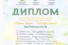 Солисты танцевального коллектива «Солнышко» (руководитель Азова Н.М.) Каюмов Н. и Колесник В. участвовали в Республиканском этнокультурном фестивале «Наш дом – Татарстан» и получили приглашение в г. Казань.