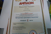Поздравляем Юнусова Айрата, занявшего 1 место в XI Международном дистанционном конкурсе "таланты России" в номинации "Декоративно-прикладного творчества". Название конкурсной работы "Чаша". Куратор конкурсной работы Данилова Тамара Васильевна. Молодцы!!! Так держать!!!