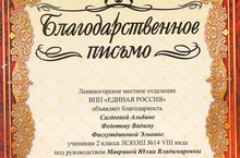 Учащиеся 2 класса - Сагдеева Альбина, Федотову Вадиму и Фасхутдинова Эльвина, под руководством Мавриной Юлии Владимировны, участвовали в конкурсе детских рисунков "Это моя мамочка!", за что были награждены благодарственным письмом от ВПП "Единая Россия". Молодцы!!! Так держать!!!
