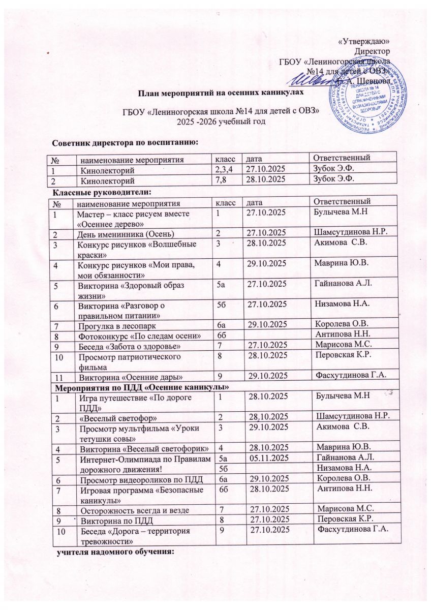 План мероприятий на осенних каникулах 2025-2026 уч.г.
