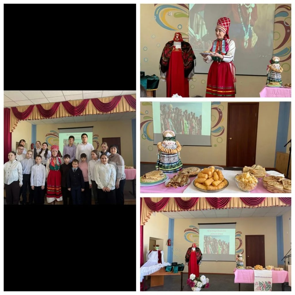 18 февраля, для 5-6 классов школы, учителями-языковедами Антиповой Н.Н, Гайнановой А.Л. Королевой О. В и Панковой И. И. было проведено открытое мероприятие "День родного языка" в рамках года народного единства и недели русского языка. На уроке ребята познакомились с культурой и традициями разных национальностей:русской, татарской и мордовской, просмотрели видеоматериал. Учителя познакомили с деталями одежд народностей, в актовом зале была организована выставка костюмов. Как носитель языка Ирина Игоревна познакомила ребят со своей культурой, с мордовской. Для учеников было приготовлено национальное угощение "орешки", которое пришлось по вкусу каждому, поведала об особенностях костюмов народа, научила простым словам "шумбрат( здравствуйте), "патяй/лелей(обращение к старшей женщине/мужчине)" После всего ребят ждало чаепитие с разнонациональными блюдами.