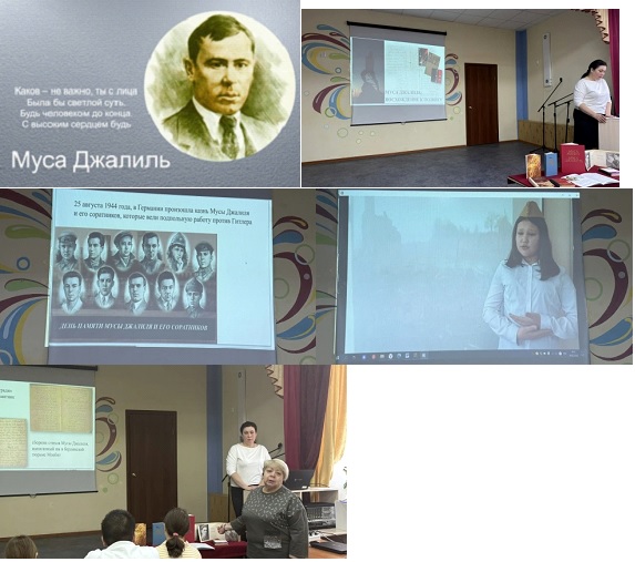 Учащиеся познакомились с биографией и творческим путем великого писателя, узнали, что жизнь Мусы Джалиля была полна испытаний: он прошел путь от простого деревенского мальчишки до отважного фронтовика, от военнопленного стал участником антифашистского сопротивления, а позже — символом национальной гордости. Многие произведения Джалиля были созданы в сложных условиях концлагеря, однако даже незаконченные строки оказались настолько яркими и глубокими, что навсегда вошли в историю русской и татарской поэзии.