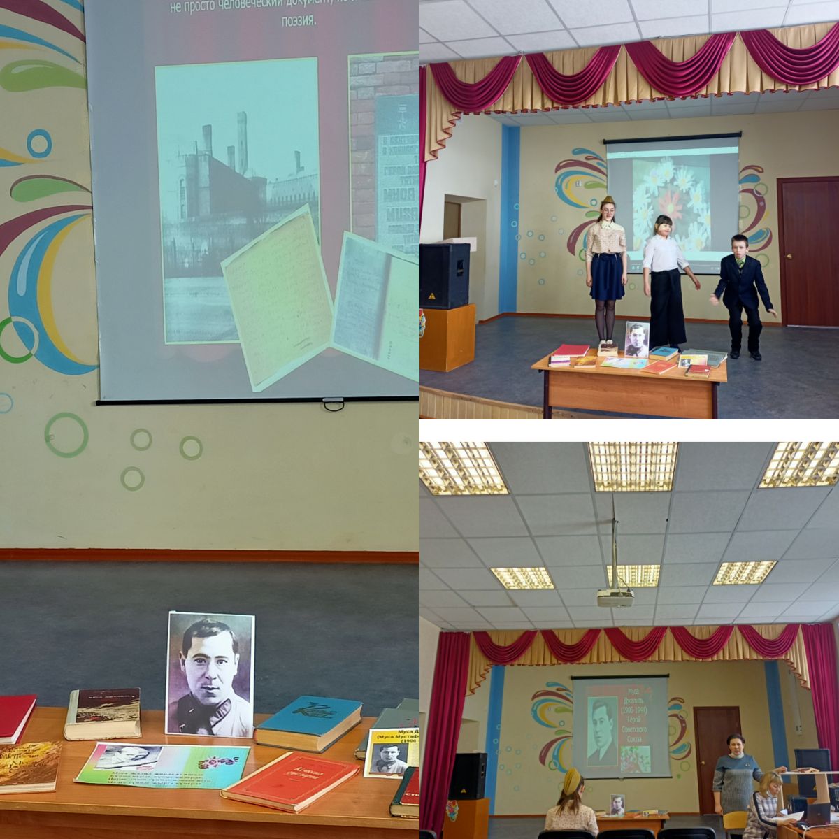 15 февраля в школе для учащихся 5-6 классов было проведено мероприятие "Герои бессмертны", посвященное 116-летию со дня рождения татарского поэта Мусы Джалиля, Героя Советского Союза, Лауреата Ленинской премии. Учителя родного языка Гайнанова А.Л., Фасхутдинова Г.А. рассказали учащимся об интересных фактах из жизни поэта, о его непростых детских и юношеских годах, литературной деятельности, о том, как он воевал, попал в плен.