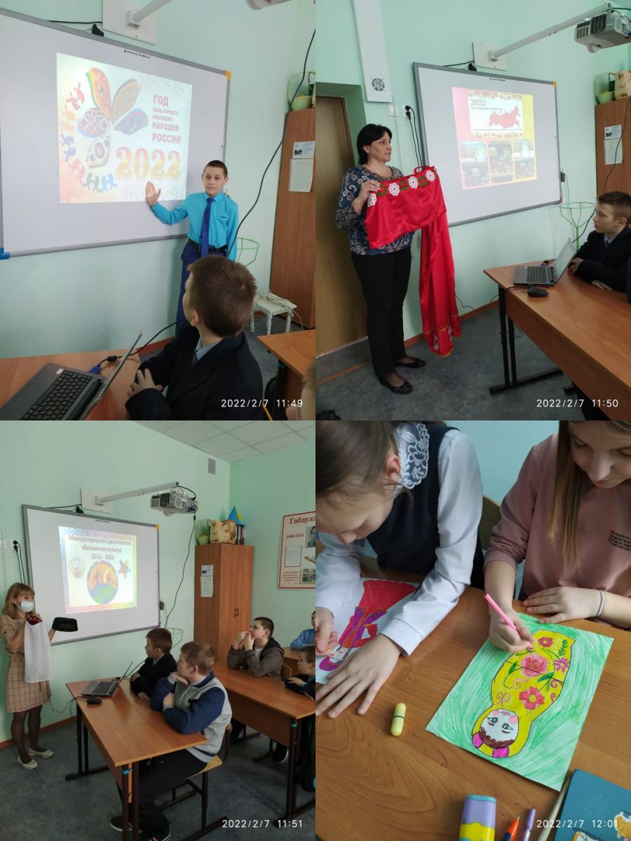 Наступивший 2022- год посвящён культурному наследию народов России. Об этом говорится в Указе который подписал президент страны Владимир Путин. Решение было принято "В целях популяризации народного искусства сохранения культурных традиций, памятников истории и культуры, этнокультурного многообразия, культурной самобытности всех народов и этнических общностей". 7 февраля учителя русского языка Антипова Н. Н. и родного языка Гайнанова А. Л. провели мероприятие по теме " Народное искусство и культурное наследие ". Педагоги рассказали о народных костюмах. Ребята подготовили сообщения о русской народной игрушке- матрёшке, о русских народных сказках ( инсценировали сказку " Колобок") Провели игру ручеёк.