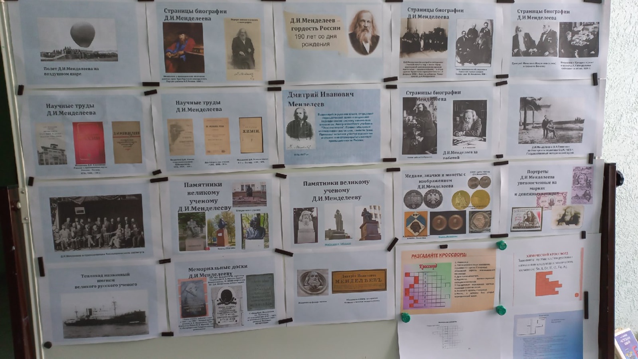 В рамках недели химии учитель химии Сабирзянов А.А. оформил стенд "Выдающийся русский химик -Д.И. Менделеев"
