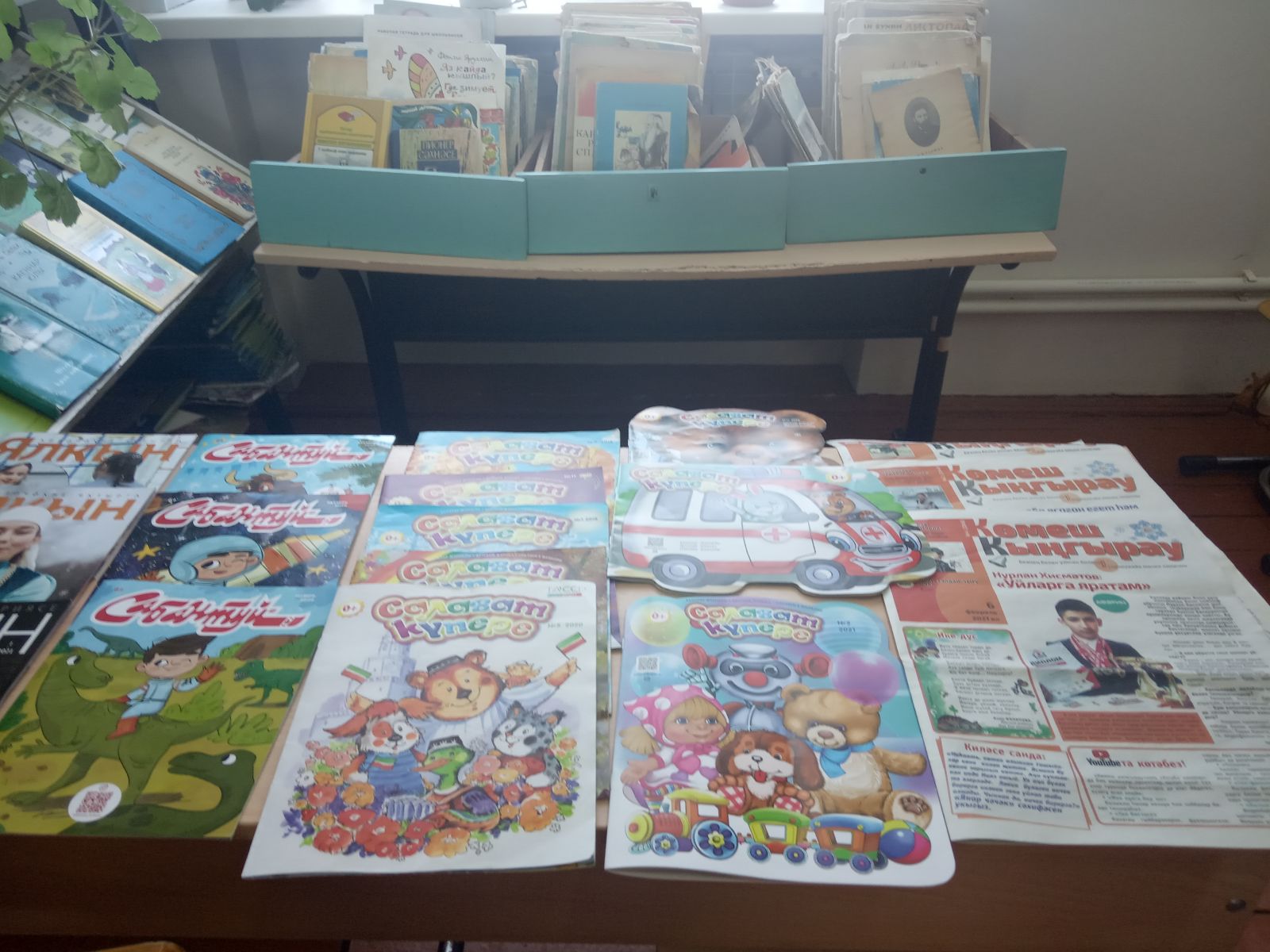 В школьной библиотеке организована выставка газет и журналов, издаваемых на татарском языке. Здесь можно познакомиться с периодическими изданиями для детей как младшего, так и среднего школьного возраста. Среди них такие популярные издания , как «Салават купере», «Ялкын», «Сабантуй», «Кемеш кынгарау» и др. Эти журналы и газеты очень любимы детьми, ведь в них можно узнать о современной моде, об увлечениях подростков, о том, как живут твои сверстники в республике и за рубежом. А ещё журнал предлагает юным читателям интересные кулинарные рецепты и секреты изготовления различных поделок . Китапханәдә татарча газета –журналларга һәм әдәби китапларга күргәзмә оештырылды. Алар арасында «Сабантуй», «Салават күпере»,” Ялкын”, “Көмеш кыңгарау” һәм башкалар.Балалар бу журналларны бик яратып укыйлар. Бугенге көндә замана баласы нәрсә белән кызыксына,нәрсә белән яши? Җавапны шул журналларда табырга була.