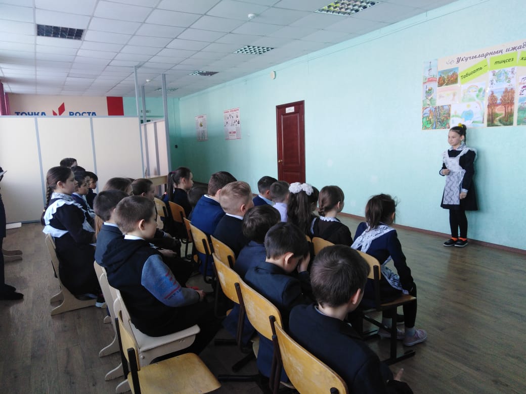 26 февраль көнне мәктәптә башлангыч сыйныф укучылары арасында шигырь сөйләүчеләр бәйгесе уздырылды. Конкурска татар шигъриятенә, туган телгә карата балаларда мәхәббәт тәрбияләү, сәнгатьле сөйләм күнекмәләре булдыру кебек максат һәм бурычлар куелган иде. 1-4 сыйныф укучылары татар шагыйрьләренең һәм үзләре иҗат иткән шигырьләрне яттан сөйләделәр. Чара бик күңелле һәм җанландыргыч үтте. Һәр чыгышны жюри бәяләп барды. Конкурс азагында җиңүчеләр билгеләнде. Бәйгенең җиңүчесе булып 4 сыйныф укучысы Мортазина Рузилә танылды. Призлы урыннарны 3 сыйныф укучылары Асабин Самат белән Гарифуллин Рәмисләр булеште. Укучыларга иҗади уңышлар телибез!26 февраля в рамках Месячника родных языков среди учащихся начальных классов был организован конкурс чтецов стихотворных произведений. Целью данного мероприятия было воспитание чувства уважения к родному языку, привития любви к татарской литературе и поэзии. Учащиеся в ходе конкурса читали свои любимые стихотворения : известных авторов и свои. В конце мероприятия жюри объявило самых лучших чтецов. Ими были признаны: Муртазина Р.( 4 класс), - победитель, а призовые места поделили Асабин С. И Гарифуллин Р.(2 класс).Мероприятие прошло в тёплой доброжелательной обстановке и оставило хорошее впечатление. Желаем учащимся дальнейших творческих достижений!