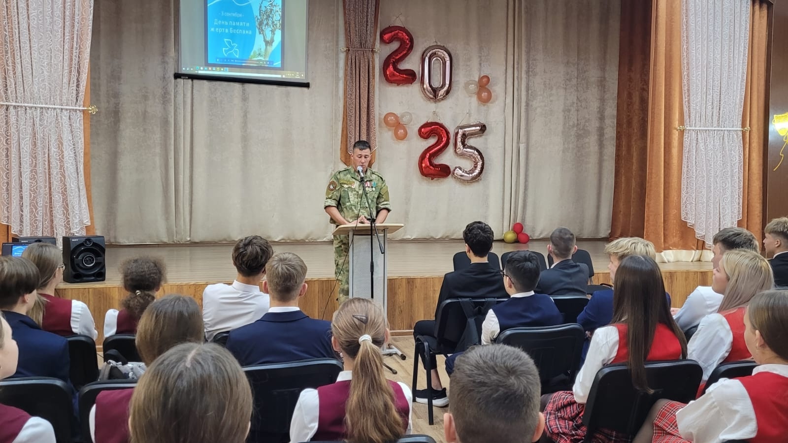 Сегодня урок мужества, посвящённый Дню солидарности в борьбе с терроризмом провел руководитель ЛМО ТРО ВООВ Боевое братство, участник грузино-осетинского конфликта Якупов Артур.