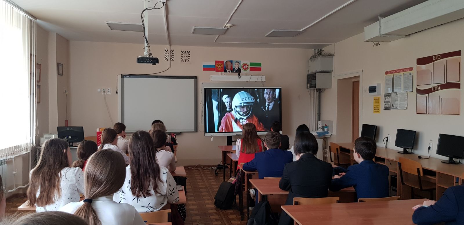 12 апреля 1961 года советский космонавт Юрий Гагарин на космическом корабле «Восток-1» стартовал с космодрома «Байконур» и впервые в мире совершил орбитальный облёт планеты Земля. Полёт в околоземном космическом пространстве продлился 108 минут. Учащиеся 8 класса (кл.рук. Агдеева В.Р.) просмотрели документальный фильм "Звезда по имени Гагарин".