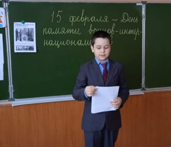 15 февраля- День памяти воинов - интернационалистов. Мы, учащиеся 4 класса( Сагидуллина И. А.) провели классный час "Время выбрало нас... ", посвященный вывода советских войск из Афганистана. Ребята рассказали о своих родственниках, участниках афганской войны. Мы поняли, что героев у Отчизны не счесть. Узнали много интересного об этой страшной войне. Самое главное, пример наших солдат учат нас верности, доблести, отваге .Эти качества не могут быть напоказ!