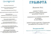 Билалова Алсу ученица 11 А класса лицея №12 города Лениногорска Республики Татарстан, принимала участие в XXXVI Турнире имени М.В. Ломоносова, где была награждена грамотой за успешное выступление на конкурсе по многоборью.