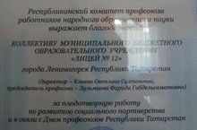 Благодарственное письмо от Республиканского комитета профсоюза работников народного образования и науки было вручено коллективу МБОУ лицея №12 за плодотворную работу по развитию социального партнерства и в связи с Днем профсоюзов РТ.