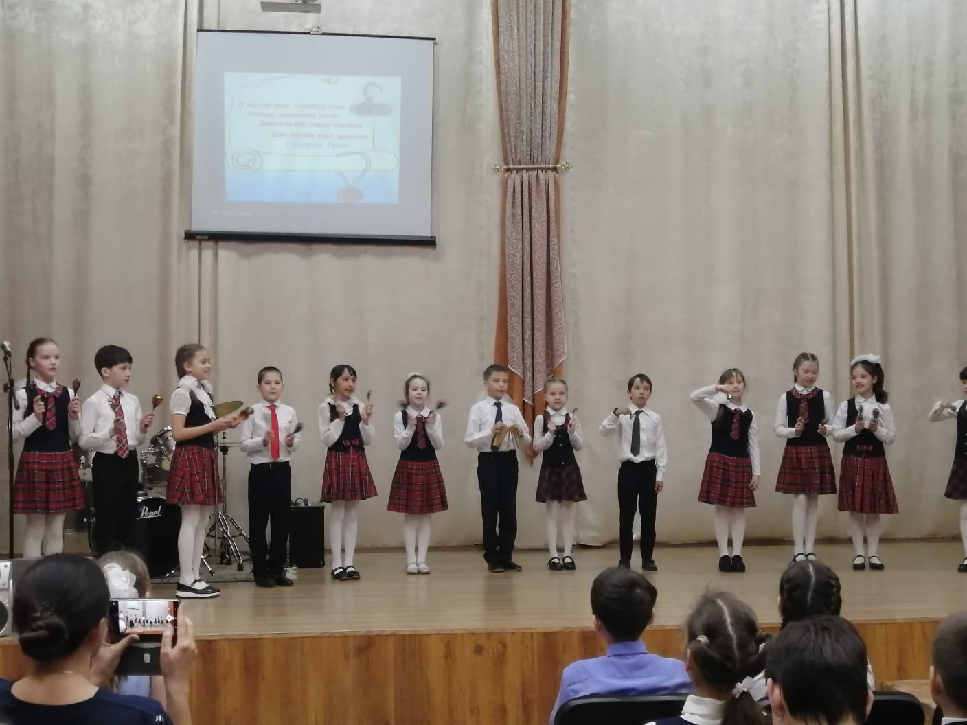 Габдулла Тукай дөньяда бары тик 27 ел гына яшәгән. Шулай булса да, ул гаять зур рухи байлыгын калдырган. Без аңа багышланган кичә үткәрдек. Кичәдә 1нче сыйныфтан алып 11 нче сыйныфлар катнашты. Укучыларыбыз сөекле язучыбыз турында белемнәрен күрсәттеләр, шигырьләрен дә сөйләделәр, җырларын җырладылар. Кичәбез “Туган тел” җыры белән тәмамланды.Родной язык - святой язык,