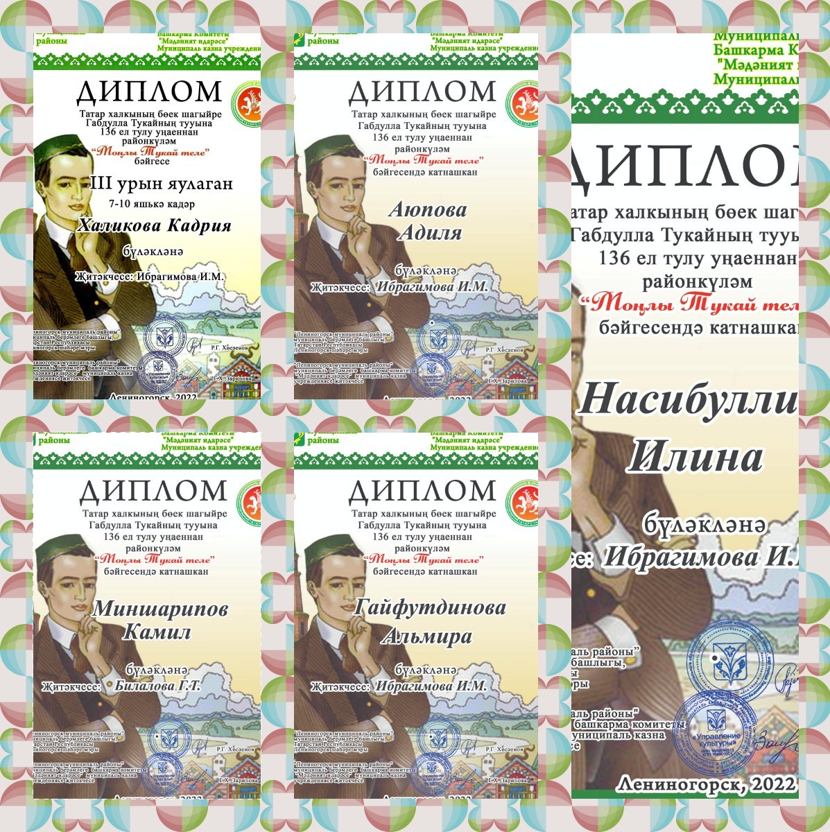 Сегодня 26 апреля состоялся торжественный митинг, посвященный 136-летию со дня рождения выдающегося татарского народного поэта Габдуллы Тукая. В связи с этим у памятника поэта прошел праздник поэзии. Состоялась торжественная церемония награждения победителей муниципального конкурса чтецов "Моңлы Тукай теле". И из нашего лицея приняли участие многие учащиеся: Аюпова А. “ Бәхетле бала”, Халикова К.”Шаян песи”, Миншарипов К. “Туган авыл”, Насибуллина И. “Һәр ялтыраган алтын түгел”, Гайфутдинова А. “Ана догасы”. А среди них 3 место заняла Халикова, ученица 2 класса (Руководитель: И. М. Ибрагимова), а остальные участники были награждены дипломами.