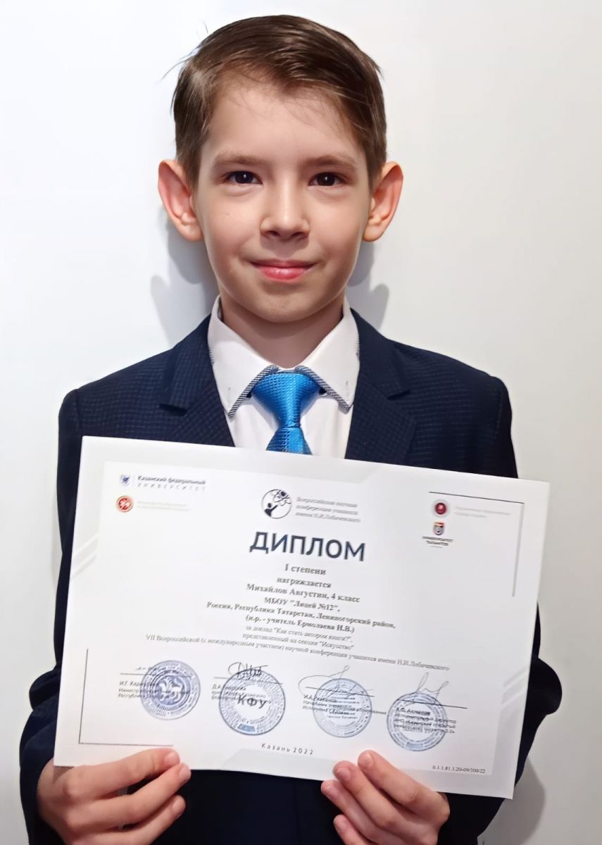 Поздравляем победителя VII Всероссийской (с международным участием) научной конференции учащихся имени Н.И. Лобачевского в г. Казань - ученика 4Б класса Михайлова Августина ( учитель Н.В.Ермолаева).