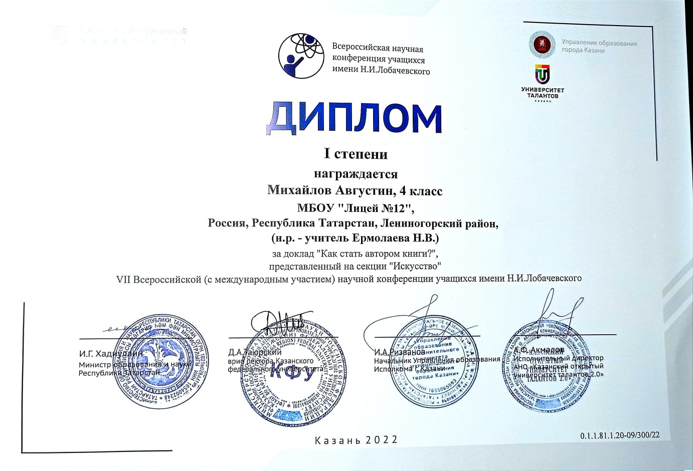 Конференция проводилась в два этапа: отборочный и заключительный. Пройдя отборочный этап, Августин с достоинством защитил свою работу на заключительном (очном) этапе в секции «Искусство». Его проектная работа "Как стать автором книги" была отмечена Дипломом 1 степени, а доклад напечатан в сборнике тезисов Конференции. 28 марта 2022 года в КСК КФУ «УНИКС» состоялась церемония награждения победителей VII Всероссийской (с международным участием) научной конференции учащихся им. Н.И.Лобачевского. Дипломами и подарками были отмечены 484 победителя и призера.