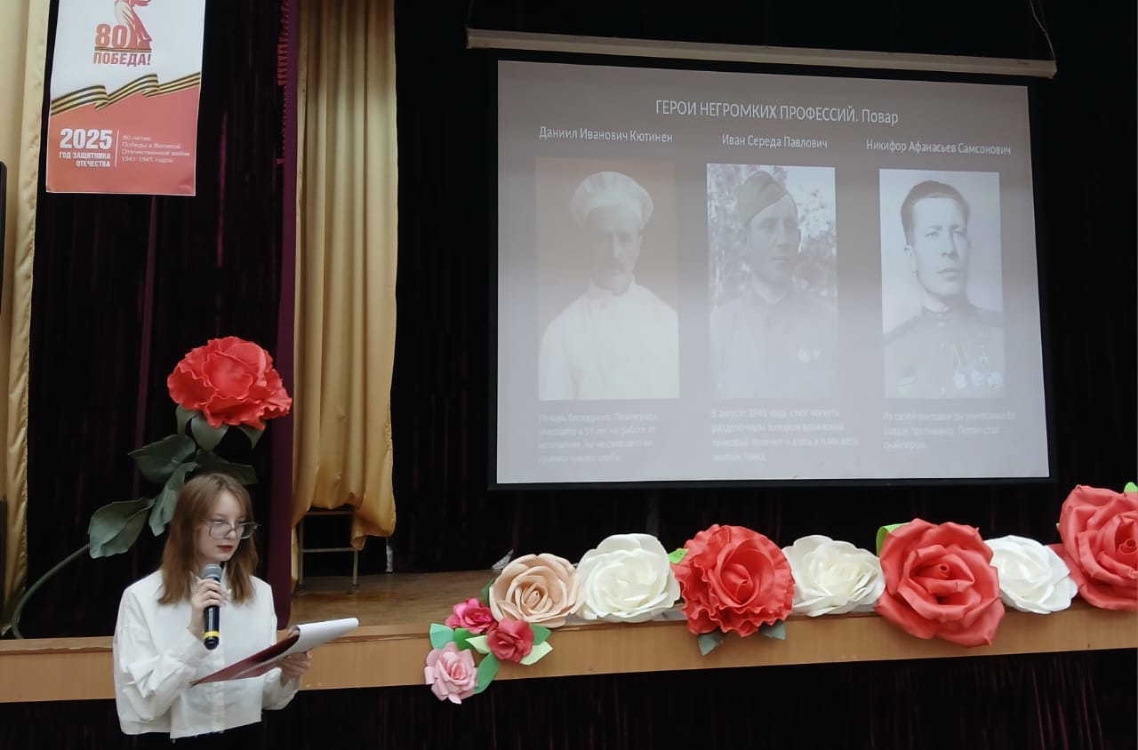 Опубликовано: 13.04.20257 апреля в рамках 80-летия празднования Победы мастер производственного обучения по специальности поварское и кондитерское дело Татьяна Александровна Митяева провела классный час в актовом зале колледжа для первокурсников на тему "Организация питания в годы ВОВ".