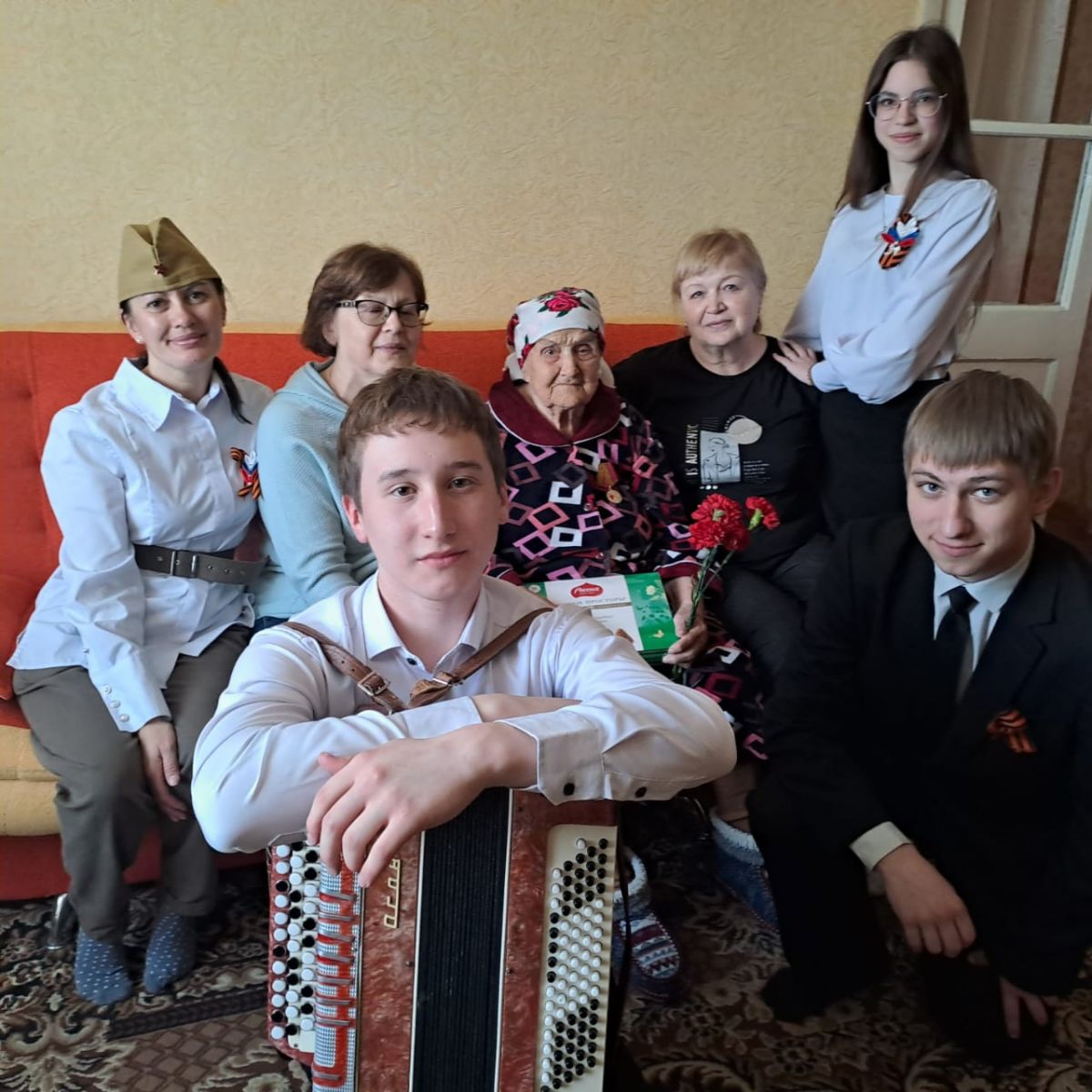 Студенты-артисты порадовали Домну Ивановну стихами и песнями военных лет, создавая атмосферу тепла и дружбы. В конце встречи были сделаны памятные фотографии, запечатлевшие этот трогательный момент.