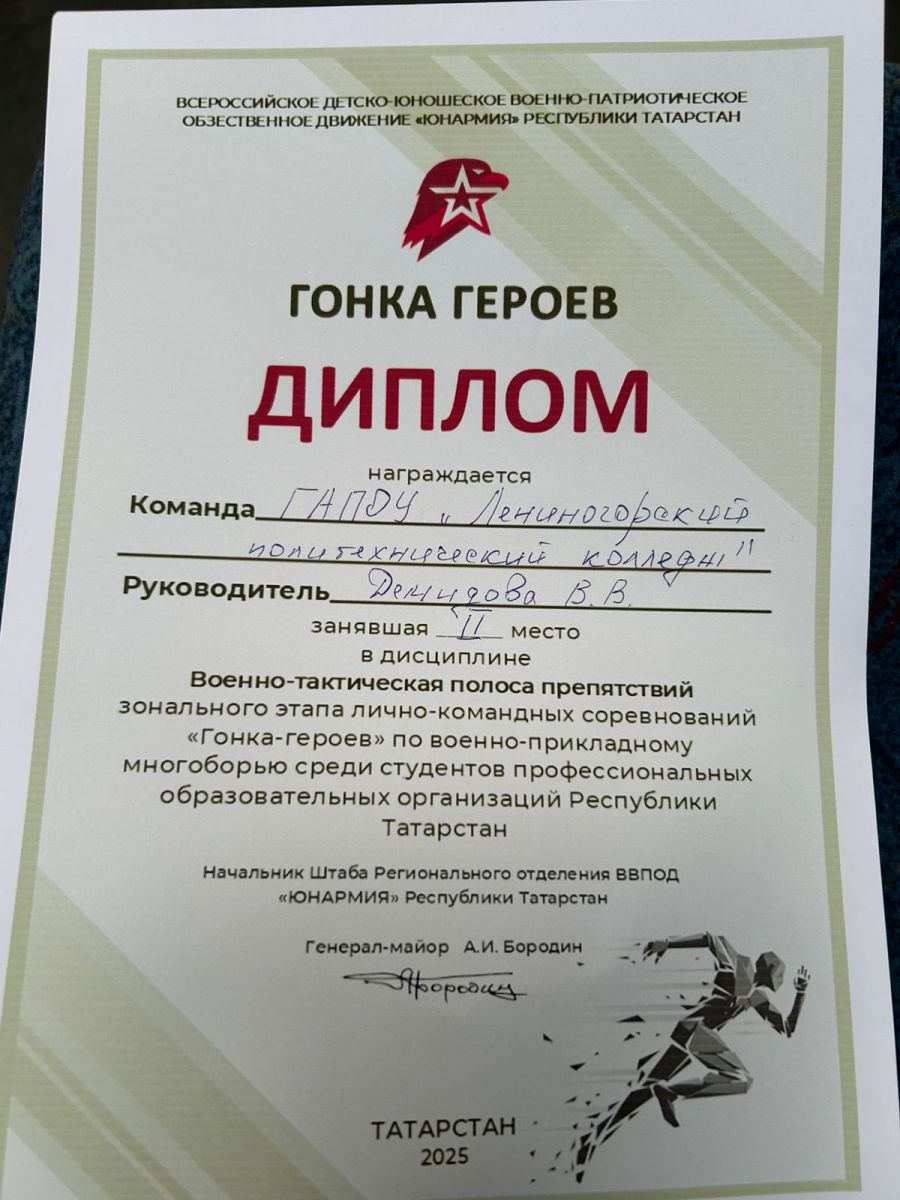 24 октября в городе Бугульма состоялся зональный этап лично-командных соревнований «Гонка героев» по военно-прикладному многоборью среди студентов ПОО РТ. Команда колледжа заняла 2 место в дисциплине «Военно-тактическая полоса препятствий».