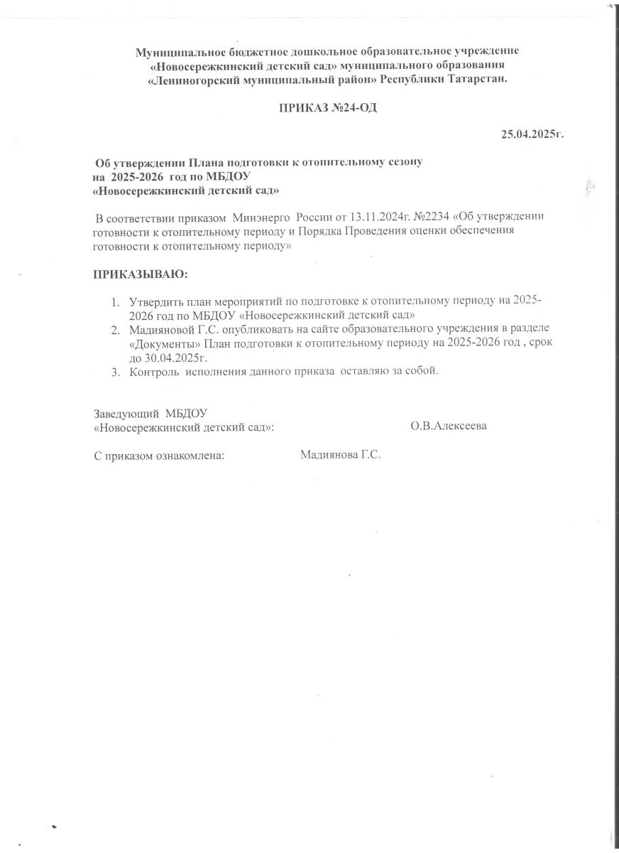 Приказ об утверждении плана к отопительному периоду 2025-2026г