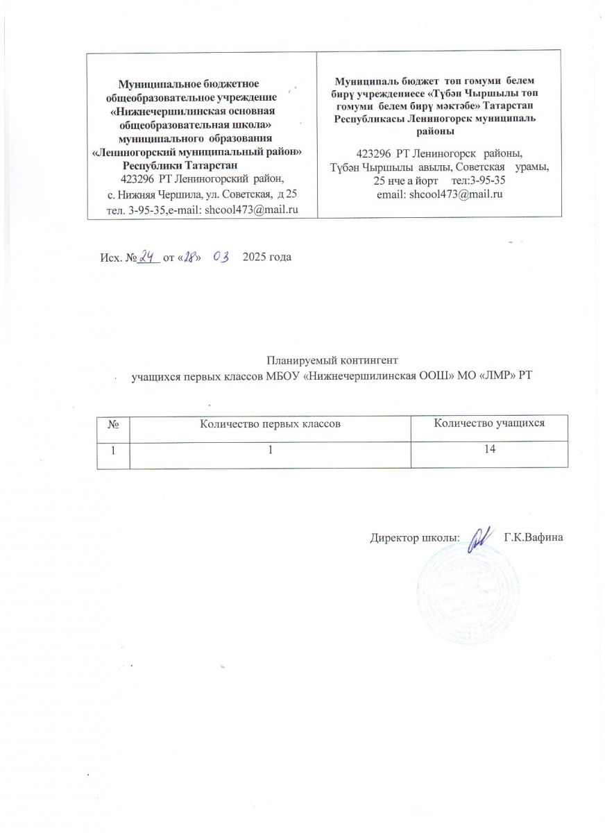 Планируемый контингент учащихся первых классов МБОУ "Нижнечершилинская ООШ" на 2025-2026 учебный год
