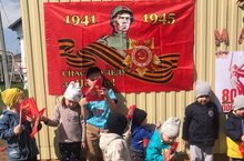 Ребята разновозрастной группы с помощью воспитателя украсили свои веранды ко дню Победы