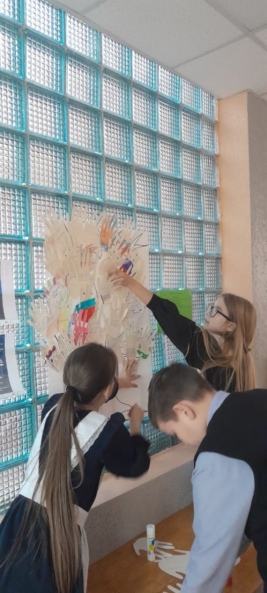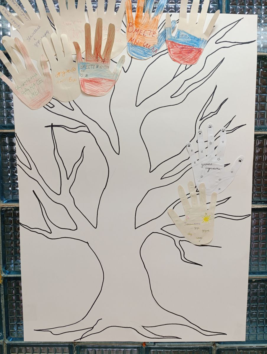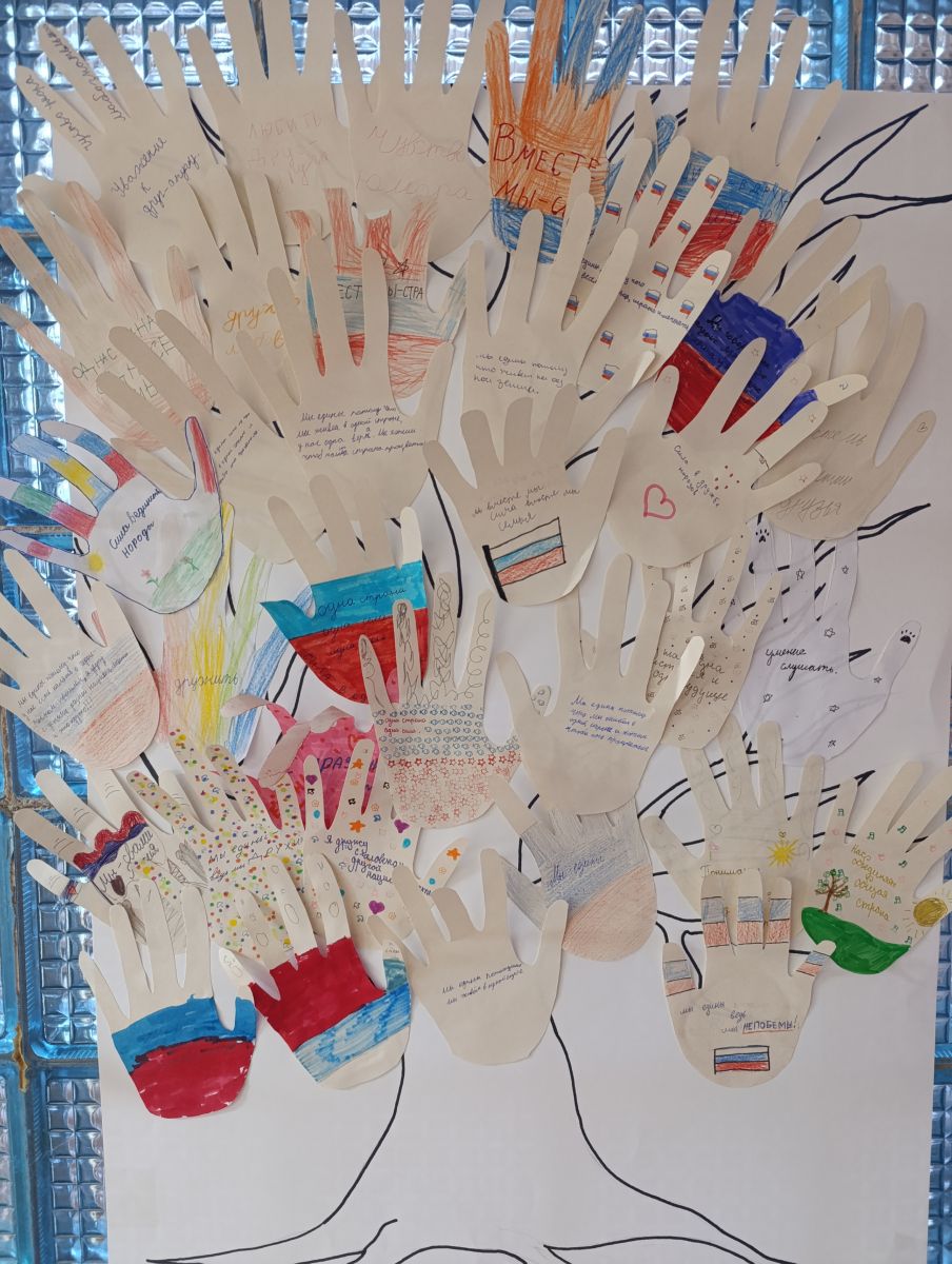 Ярким символом праздника стало «Дерево Единства», которое «выросло» в холле школы. Ребята обводили свои ладошки, вырезали их и подписывали добрыми пожеланиями. Каждая детская ладошка стала листочком на большом дереве, демонстрируя, что все мы, такие разные, составляем одно целое.