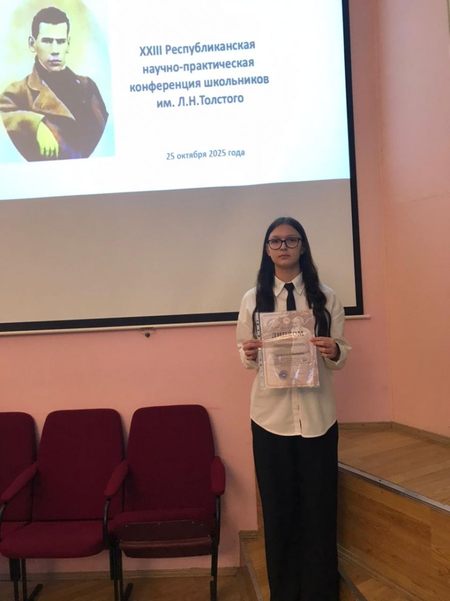 Учащаяся 10-го класса Трункина Валерия успешно выступила на ежегодной республиканской научно-практической конференции школьников имени Льва Николаевича Толстого, завоевав почетное второе место.Работа Валерии была подготовлена под научным руководством преподавателя русского языка и литературы Богачевой Анастасии Ивановны. Поздравляем ученицу и наставника с заслуженным успехом и желаем новых достижений в научной деятельности!