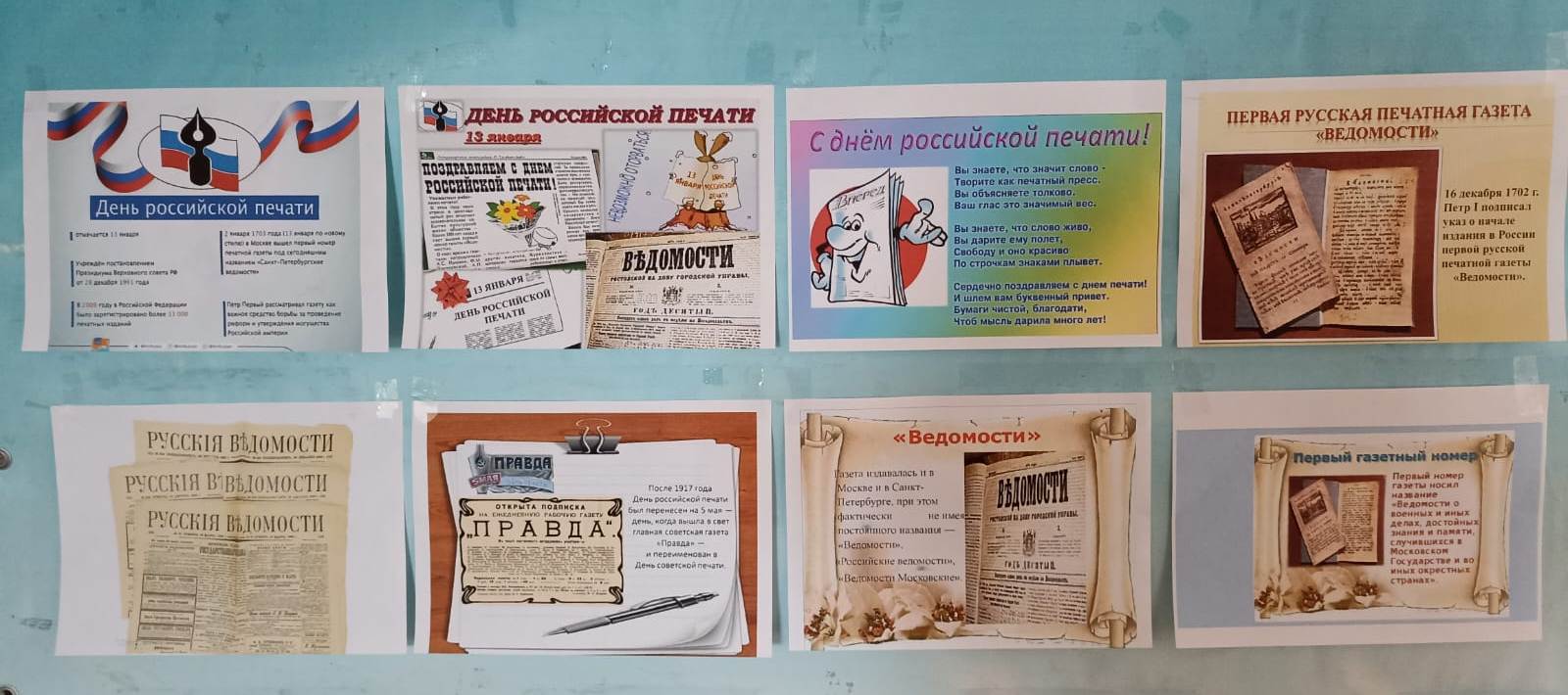 13 января школьным библиотекарем Шилкиной Н.В. был оформлен информационный стенд «День российской печати». 320 лет назад (1703) в Москве вышла в свет первая русская газета «Ведомости о военных и иных делах, достойных знания и памяти, случившихся в Московском Государстве и в иных окрестных странах».