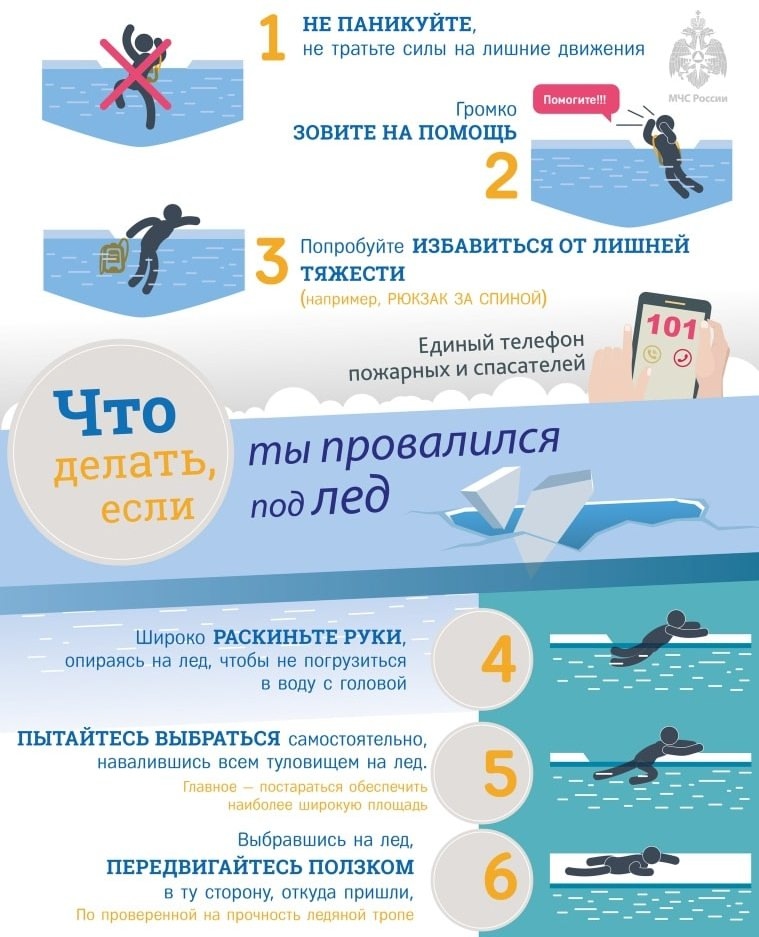 Если под ногами провалился лед, надо расставив широко руки, удерживаться на поверхности льда, без резких движений стараться выползти на твердый лед, а затем лежа на спине или груди, продвигаться в ту сторону, откуда пришел. Одновременно с этим звать на помощь.